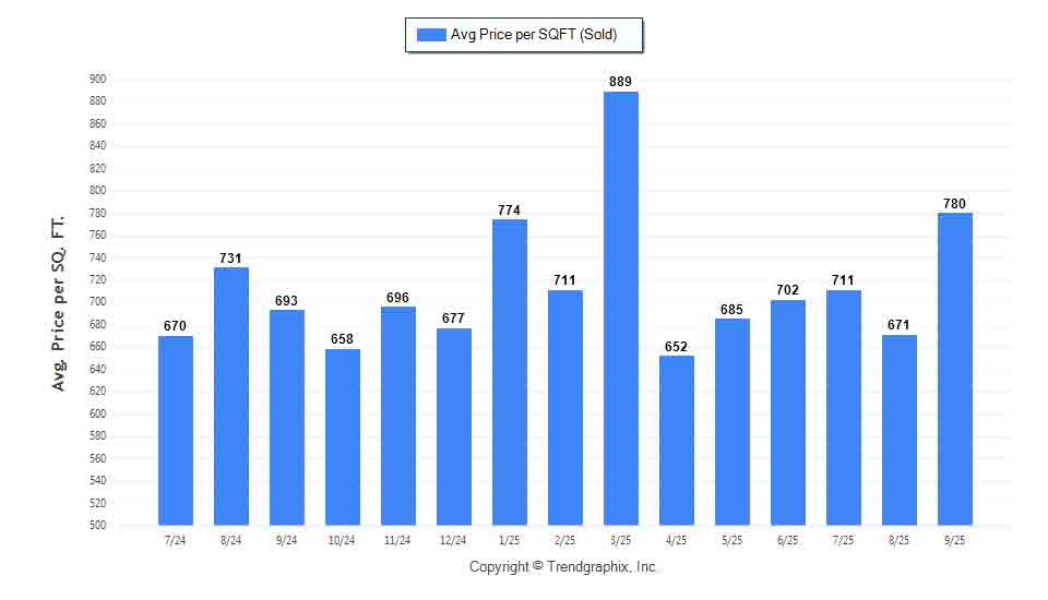 The Average Sold Price per Square Footage is a great indicator for the direction of property values. Since Median Sold Price and Average Sold Price can be impacted by the 'mix' of high or low end properties in the market, the Average Sold Price per Square Footage is a more normalized indicator on the direction of property values. The September 2025 Average Sold Price per Square Footage of $780 was up 16.2% from $671 last month and up 12.6% from $693 in September of last year.