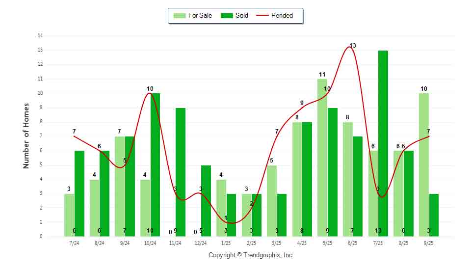 September 2025 was a Neutral market! The number of for sale listings was up 42.9% from one year earlier and up 66.7% from the previous month. The number of sold listings decreased 57.1% year over year and decreased 50% month over month. The number of under contract listings was up 16.7% compared to previous month and up 40% compared to previous year. The Months of Inventory based on Closed Sales was 3.3, up 230% from the previous year.