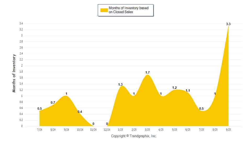 The September 2025 Months of Inventory based on Closed Sales of 3.3 was increased by 230% compared to last year and up 230% compared to last month. September 2025 was Neutral market.