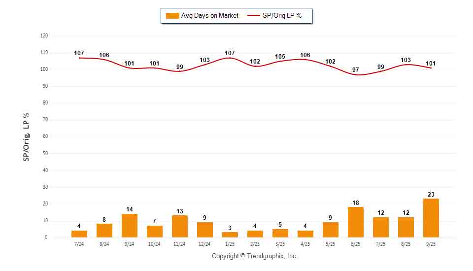 The average Days on Market (DOM) shows how many days the average property is on the market before it sells. An upward trend in DOM trends to indicate a move towards more of a Buyer’s market, a downward trend indicates a move towards more of a Seller’s market. The DOM for September 2025 was 23, up 91.7% from 12 days last month and up 64.3% from 14 days in September of last year.