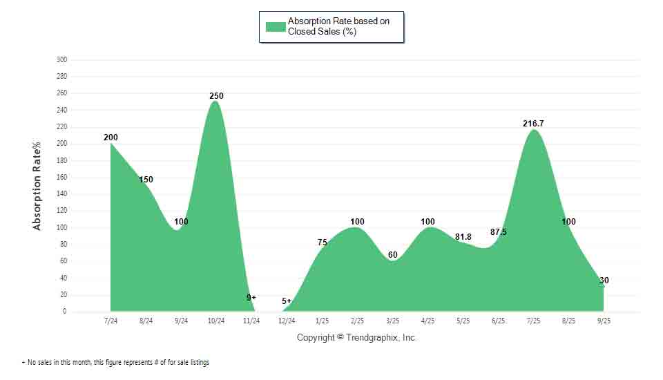 The September 2025 Absorption Rate based on Closed Sales of 30 was decreased by 70% compared to last year and down 70% compared to last month.