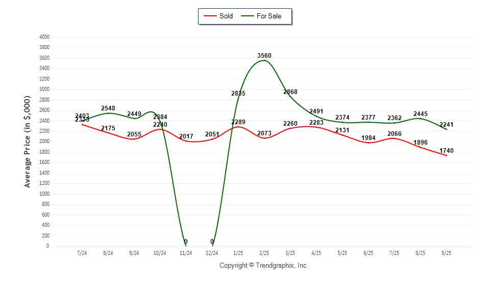 The Average Sold Price in September was $1,740,000, down 15.3% from $2,055,000 in September of 2024 and down 8.2% from $1,896,000 last month.